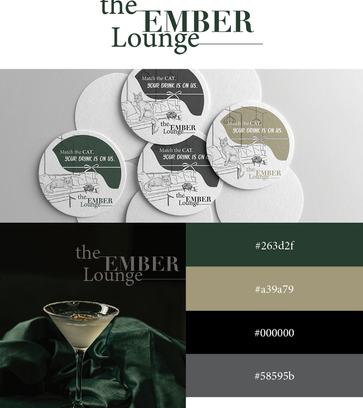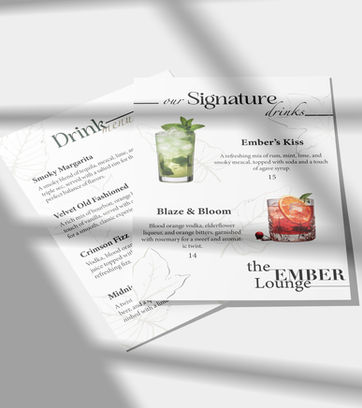 Ember Lounge is a branding project for a bar setting, featuring cohesive print materials like menus, coasters, and flyers. The design blends elegance with a moody palette to create a sophisticated nightlife aesthetic.